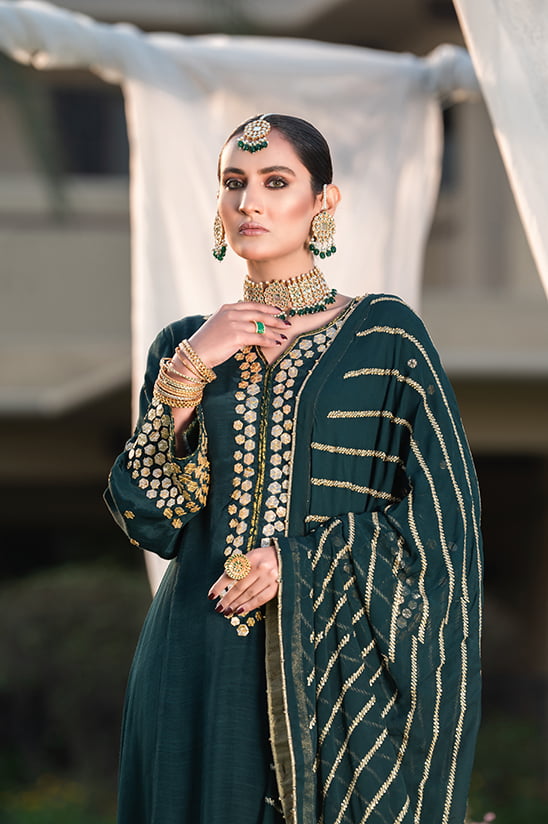 Copper Gold Panni Gotta Hand Work blooms with Kaliyan and Jamawar Facing in this emerald green Raw Silk Canvas. Style as a flowing maxi for an unforgettable festive look. This Beautiful hand crafted piece is paired with Chiffon Dupptta having Copper Gold embroidery and Sitara that enhances the galore of this intrinsic dress.Copper Gold Panni Gotta Hand Work blooms with Kaliyan and Jamawar Facing in this emerald green Raw Silk Canvas. Style as a flowing maxi for an unforgettable festive look. This Beautiful hand crafted piece is paired with Chiffon Dupptta having Copper Gold embroidery and Sitara that enhances the galore of this intrinsic dress.