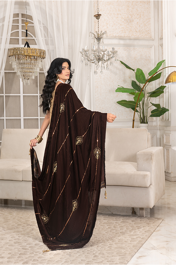 Where Luxury Meets Tradition. A timeless velvet kalidar meets the soft grace of a chiffon dupatta adorned with delicate tilla boti. Every floral motif on the velvet is elevated with hand-worked cut dana and shimmering stones, creating a look that speaks of luxury and refinement. The dupatta, finished with elegant tissue facing, adds the perfect touch of finesse. Step into the season with an ensemble crafted to make every woman feel extraordinary.