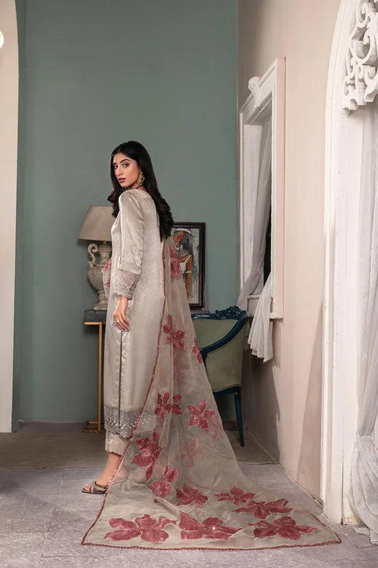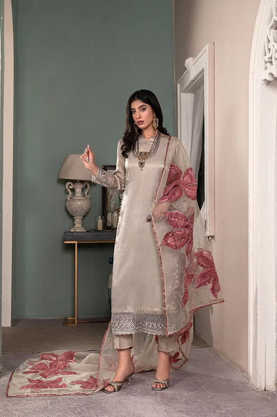 Step into elegance with this pure light cement silk straight shirt paired with straight pants, creating a refined silhouette that exudes sophistication. Adorned with a pure organza hand-painted dupatta featuring delicate handwork of nakshi and sitara, finished with lace detailing all around, it’s a masterpiece of timeless charm and artistry.