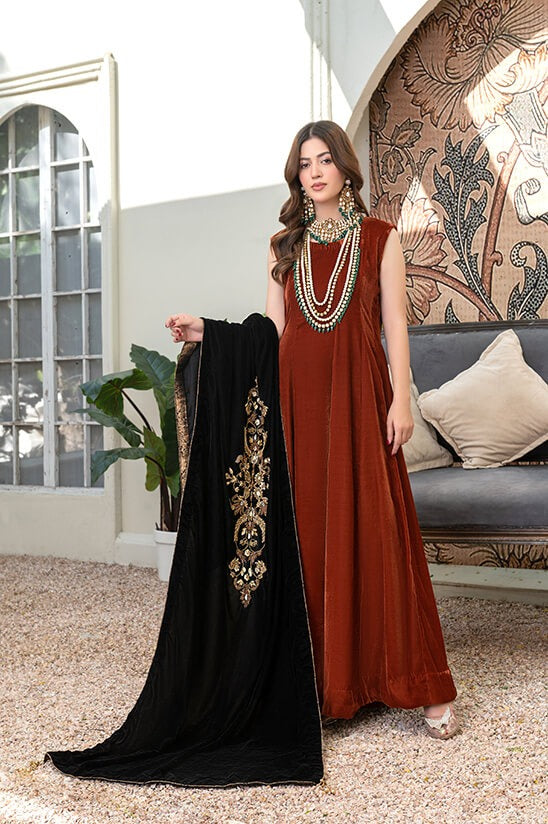 This elegant black velvet shawl is adorned with intricate handwork, featuring delicate Kora and Dabka embroidery, Gota embellishments, and glistening stones. The shawl is further enhanced with a luxurious Jamawar border, adding a touch of opulence. Tassels on all four sides complete this exquisite piece, making it a perfect accessory for special occasions, exuding sophistication and grace.