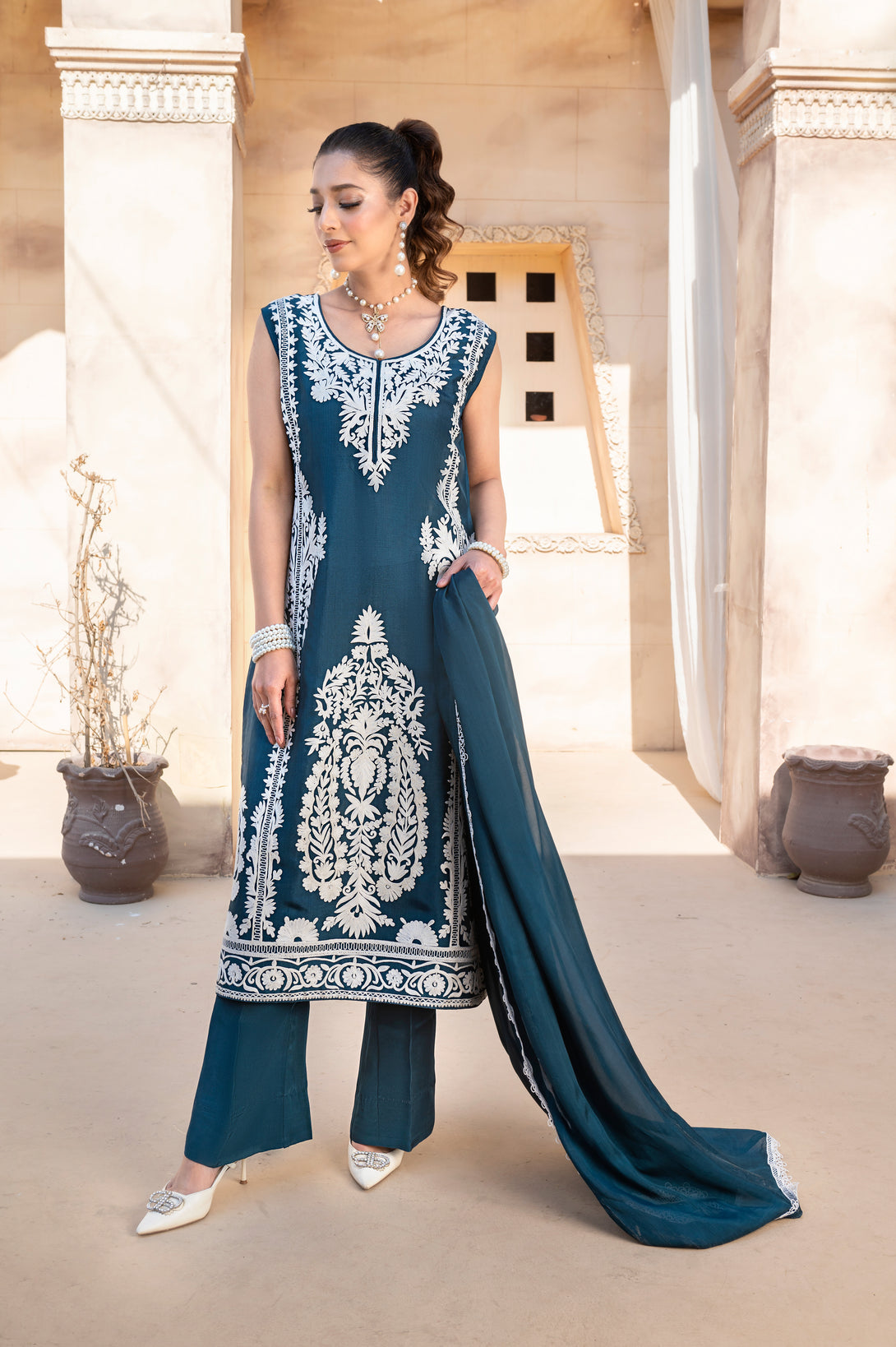 It is paired with chic silk bell bottoms, adding a contemporary edge to the traditional design. Completing the look is a silk dupatta, finished with white lace all around, lending softness and charm to the overall outfit.