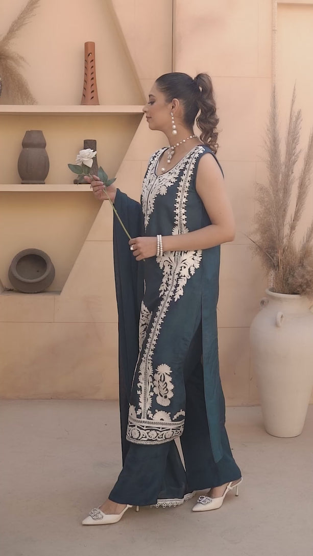 Hazal is a graceful silk ensemble that embodies understated elegance. The silk shirt is adorned with delicate white aari embroidery all over, creating a refined and timeless texture that enhances the soft flow of the silhouette.