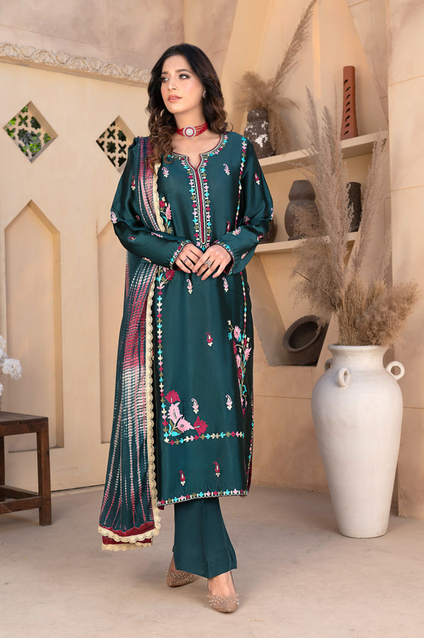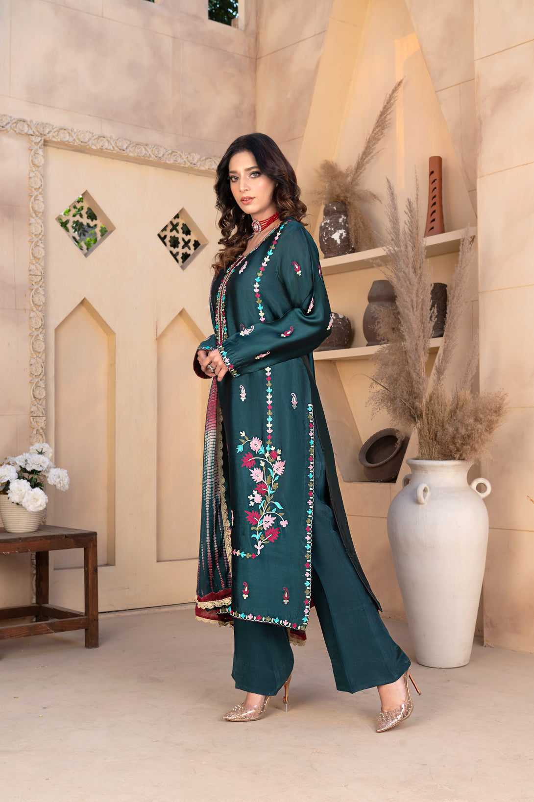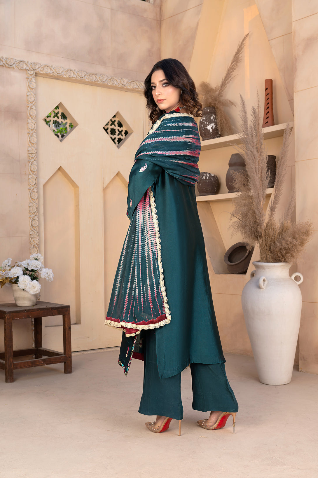It is paired with chic silk bell bottoms, giving the ensemble a modern silhouette. The look is completed with a stunning silk dupatta, featuring tie-and-dye detailing and elegantly finished with lace all around, offering both color and charm.