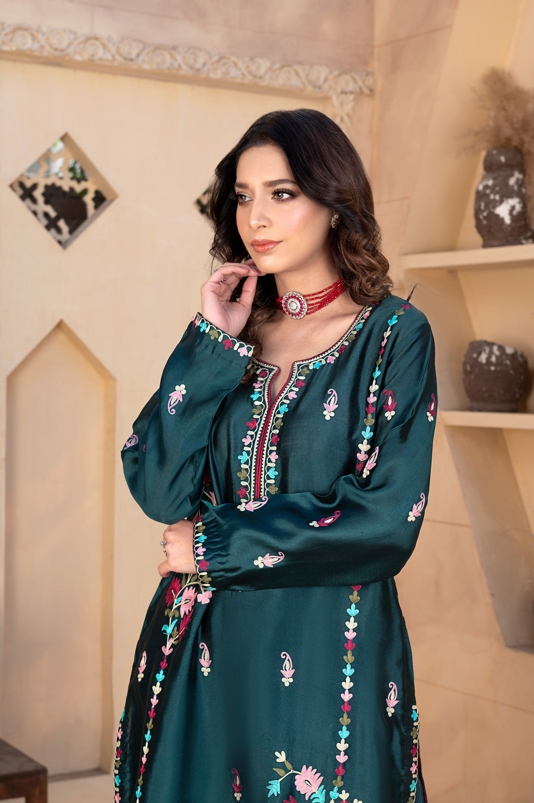 Radiant and artistic, Inara is a graceful silk shirt adorned with multi-shade aari embroidery all over, creating a vibrant play of colors against the rich silk base. The embroidery reflects timeless craftsmanship while adding a contemporary flair.