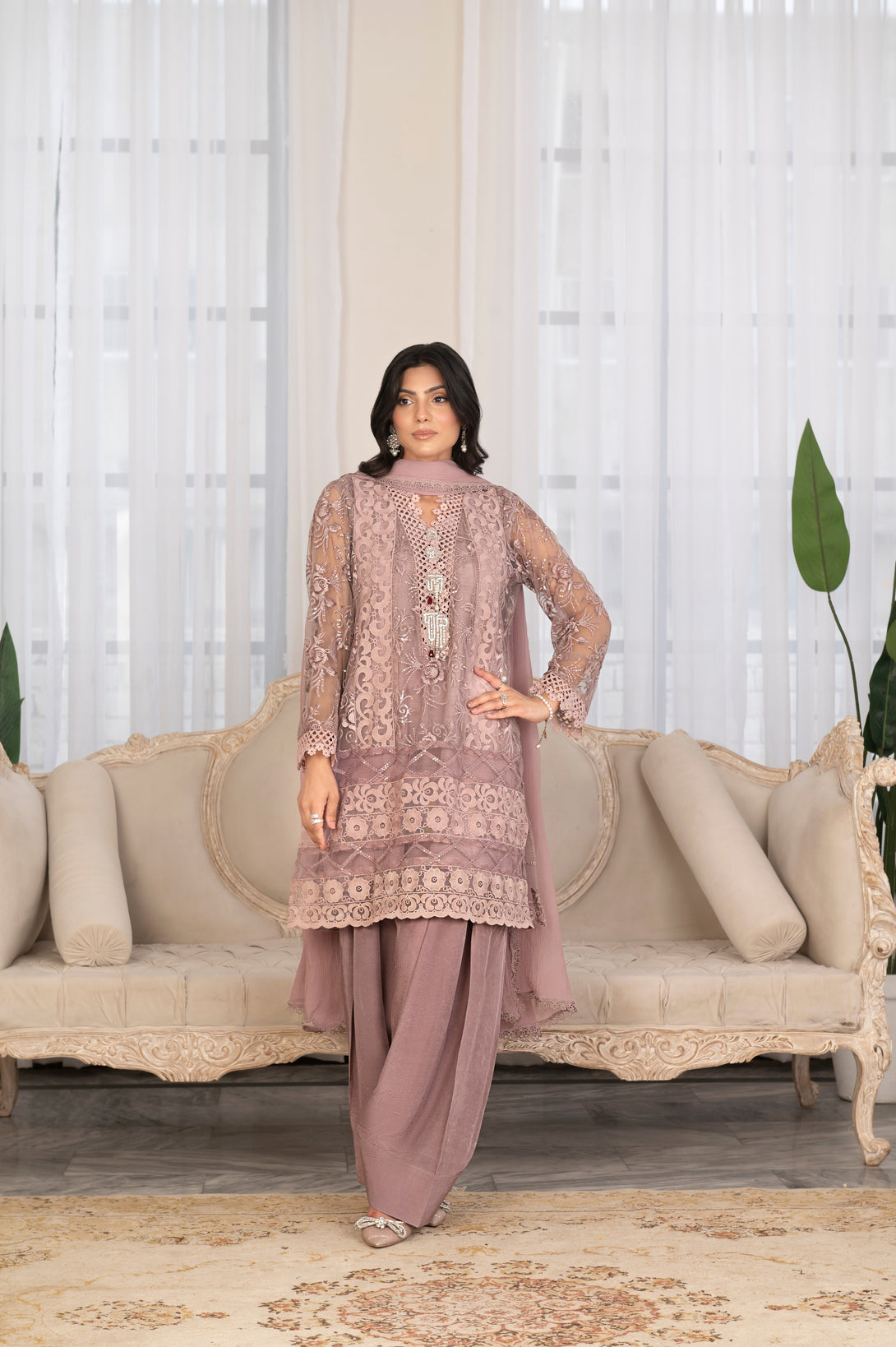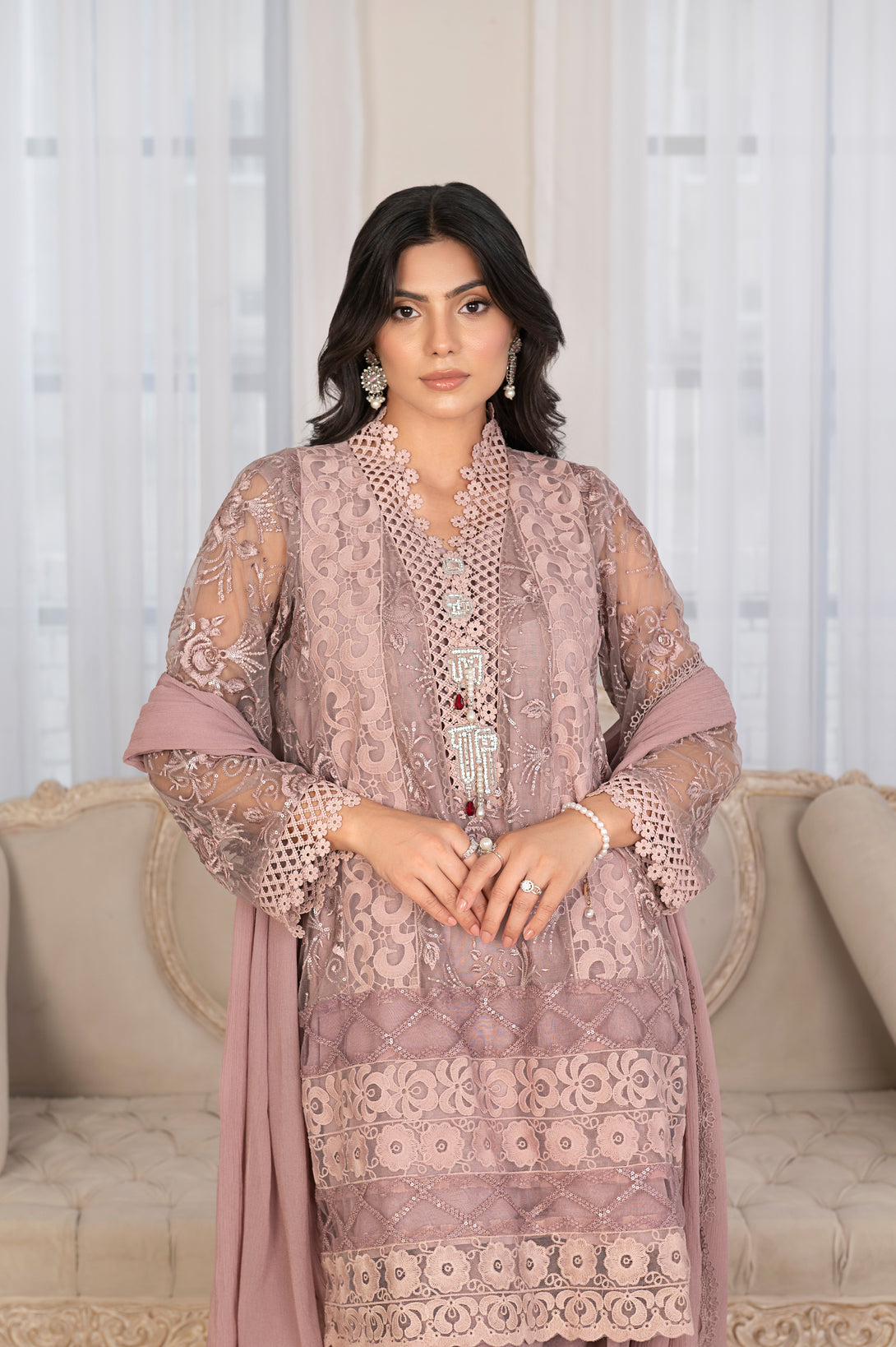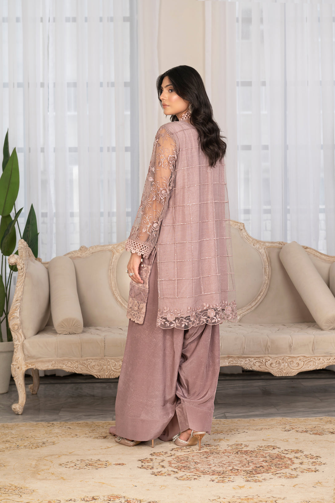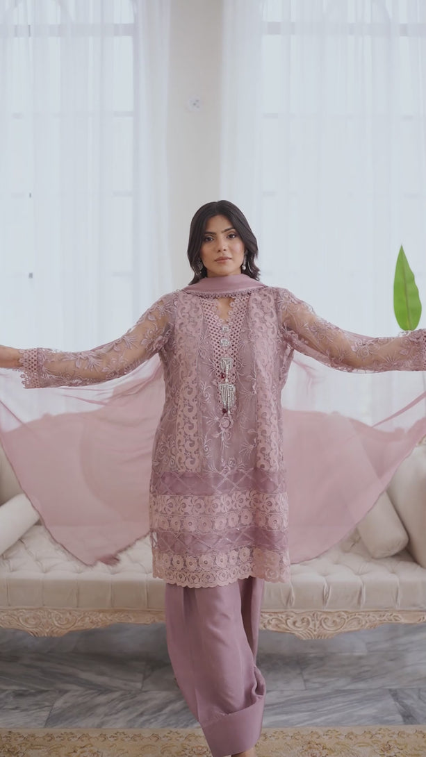It is paired with a classic farshi shalwar, bringing a traditional flow and elegance to the silhouette. Completing the ensemble is a lightweight chiffon dupatta, finished with a lace border all around, offering a refined and graceful drape.