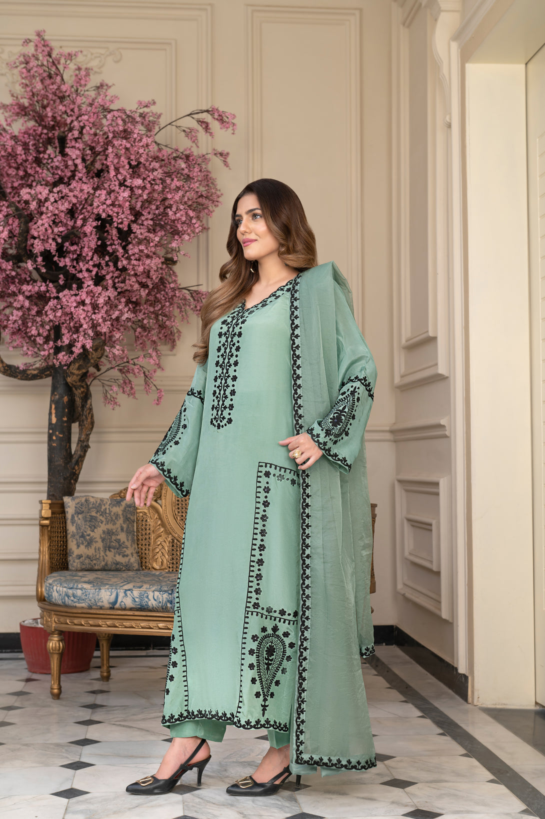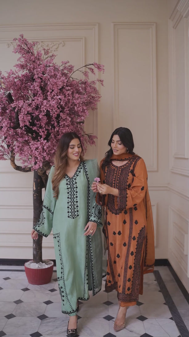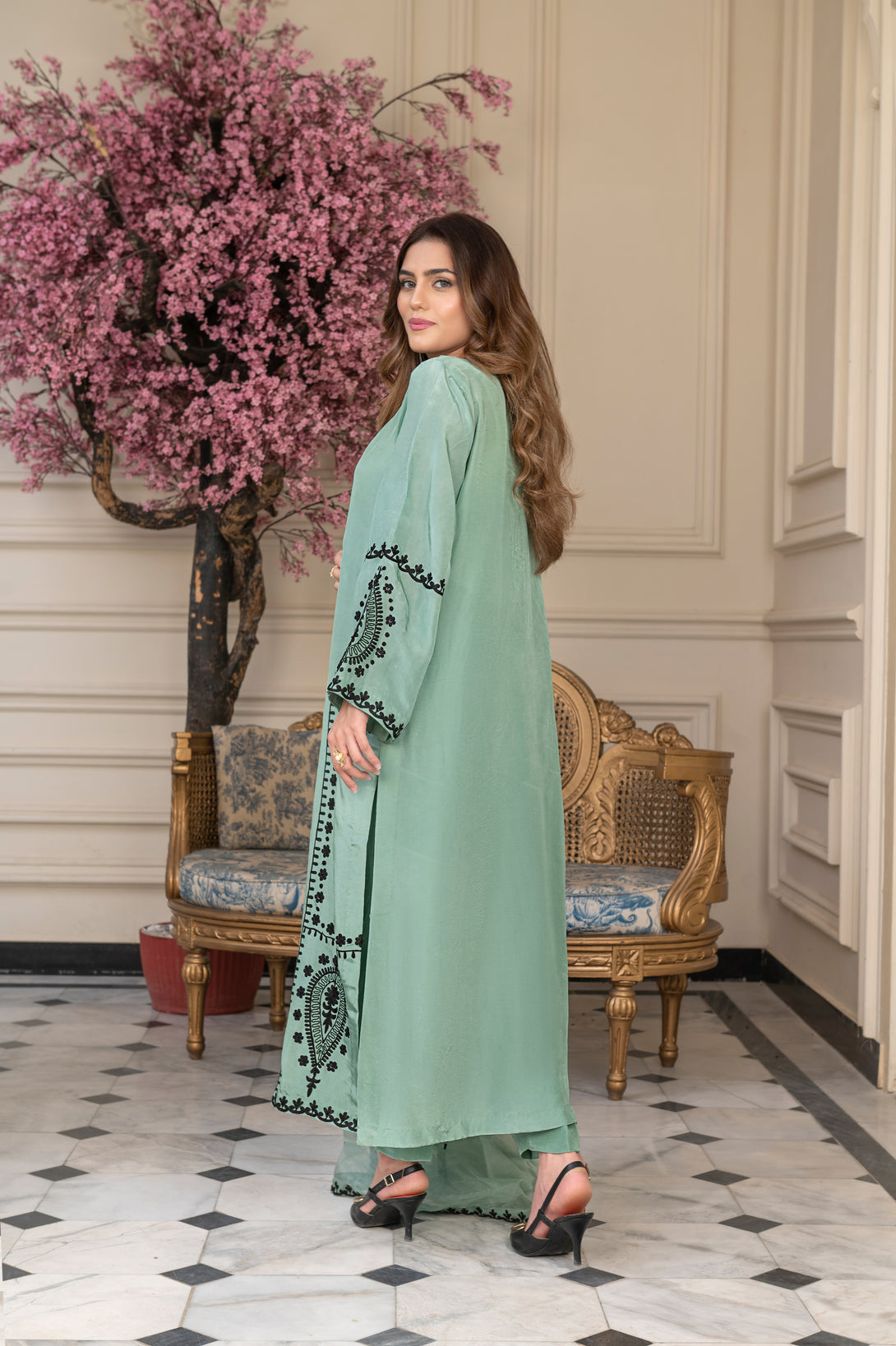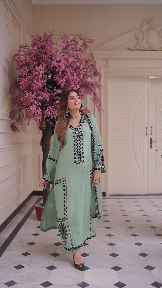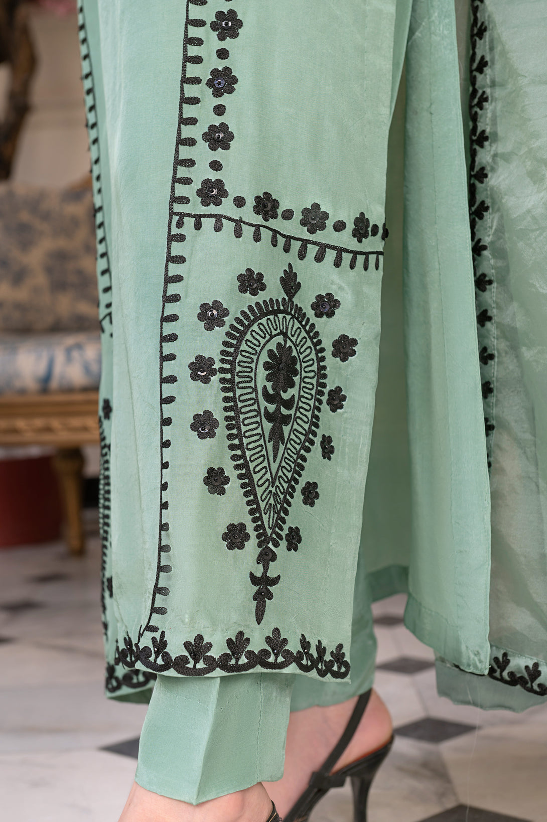 It is paired with plain straight silk pants for a sleek silhouette, letting the embroidery take center stage. The look is completed with a soft organza dupatta, exquisitely finished with embroidery on all four sides, adding finesse and sophistication to the outfit.