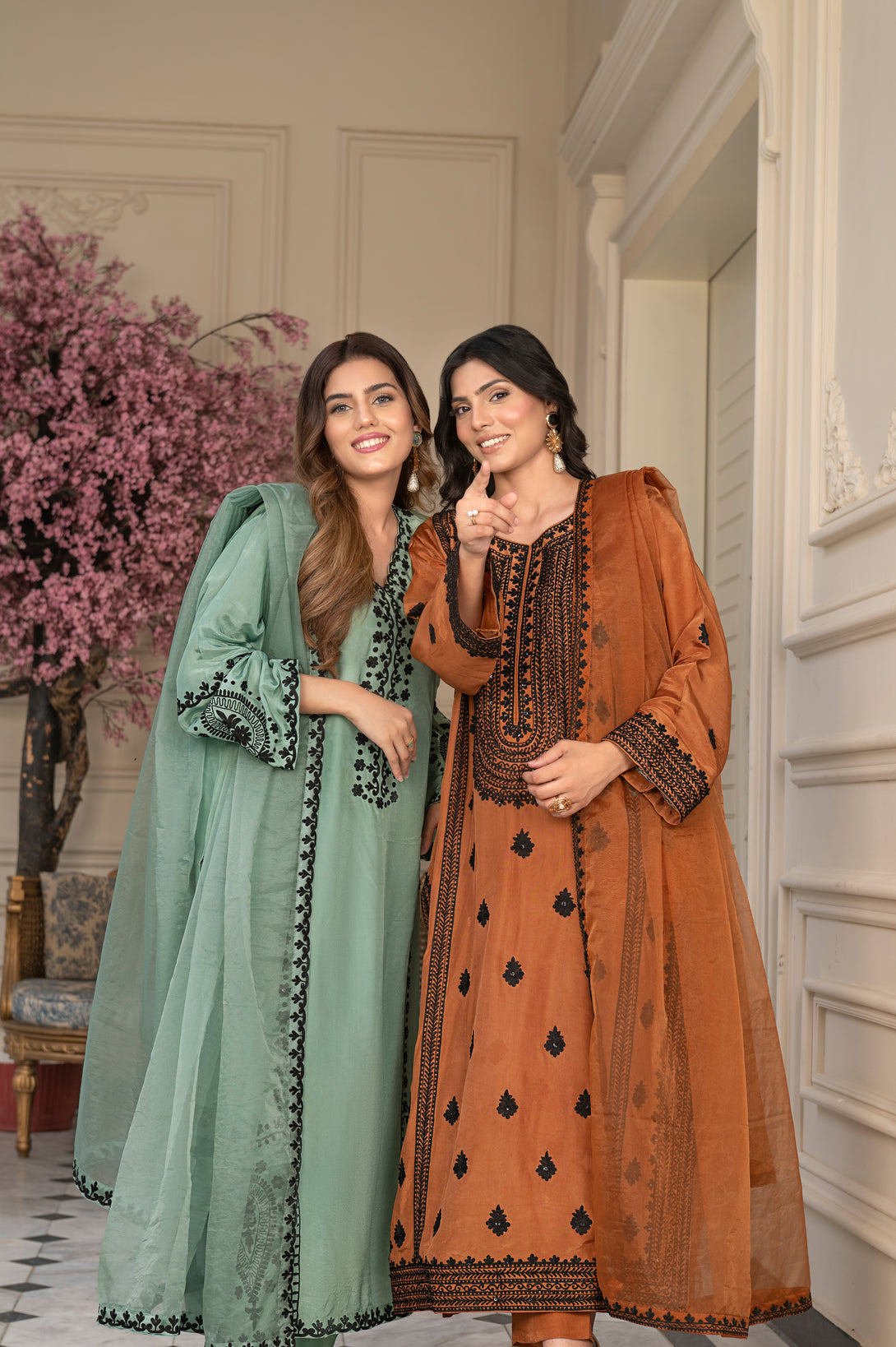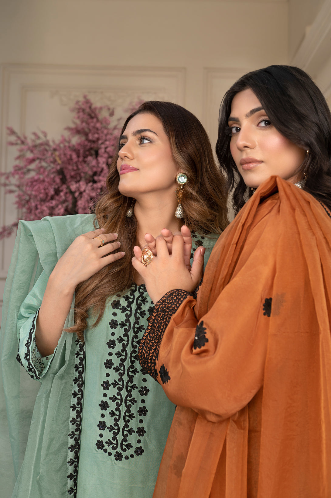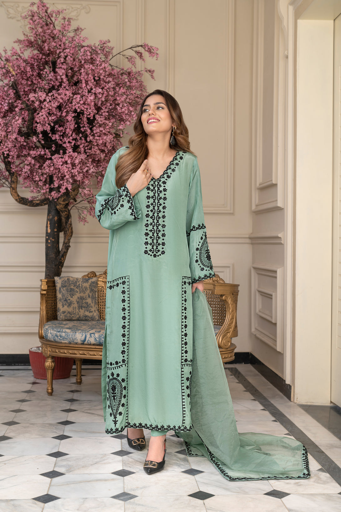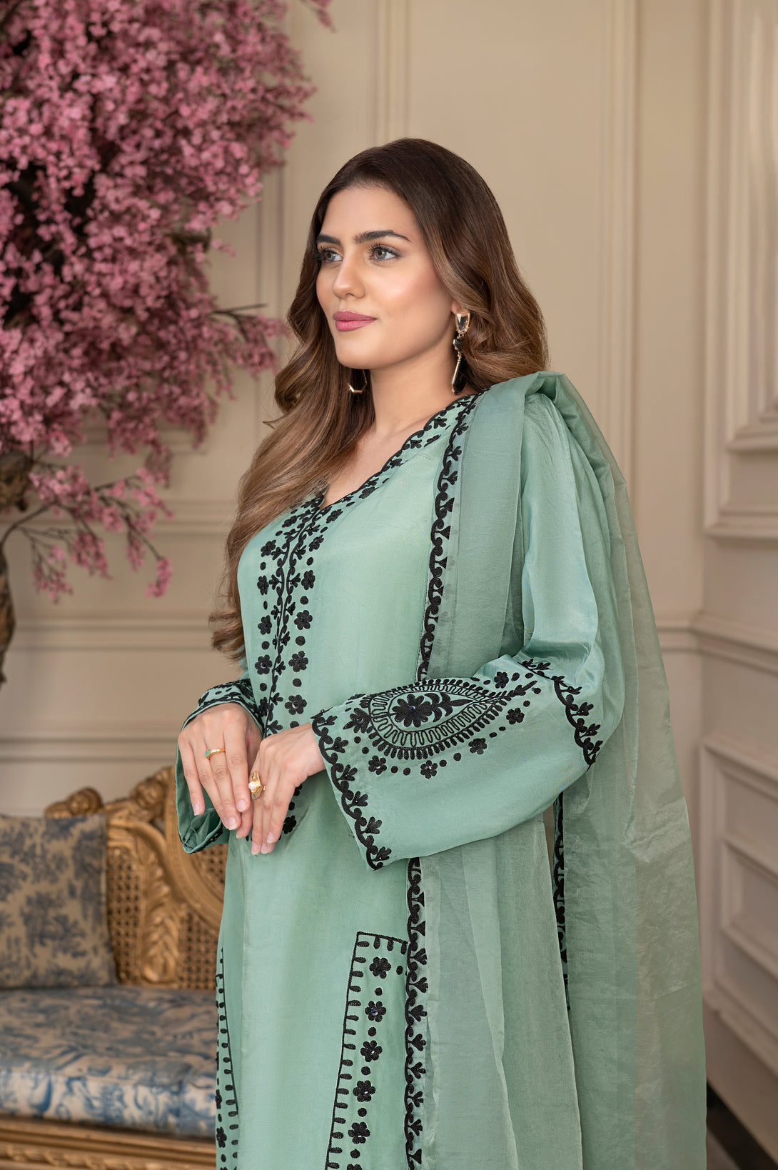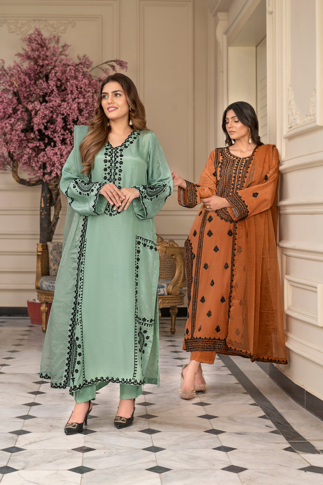 It is paired with plain straight silk pants for a sleek silhouette, letting the embroidery take center stage. The look is completed with a soft organza dupatta, exquisitely finished with embroidery on all four sides, adding finesse and sophistication to the outfit.