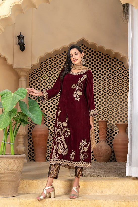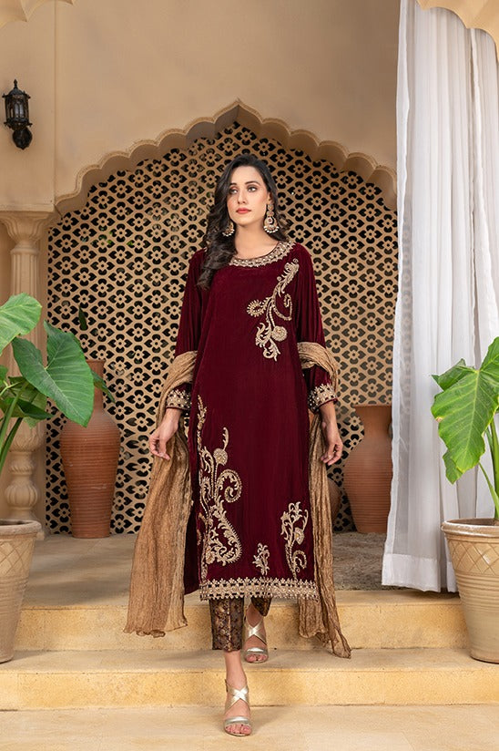 A straight Velvet Dark Maroon Shirt, incorporated with captivating golden Tilla, Dori and Dabka handwork, further enhanced by dainty patches around neckline, sleeves and Daman, paired up with A customary Jamawar Trouser combining Copper and Maroon tones, and a shimmery copper colored Crush Silk Dupatta