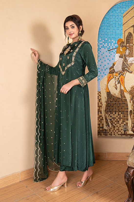 A Regal and bold ensemble with kora dabka and tilla work in the elegant dark green colour with shimmering gold. It accompanies a beautiful chiffon dupatta with panni scallops and work all around. This gorgeous and classy silk maxi dress shows the intricately detailed embellishments and would certainly create a phenomenal statement for festive or party looks.