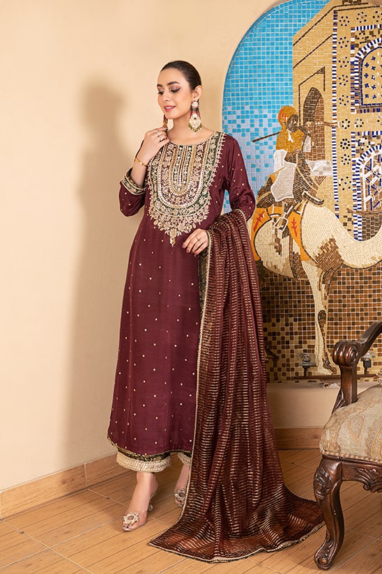 A Long maxi dress with beautifully ornamented and artfully arranged kora dabka, tilla and stone handwork on a gossamer raw silk base rendered in dark maroon in “shab e roz” . This intrinsically beautiful shirt is paired with diaphanous organza dupatta with jamawar finishing and a jamawar trouser embellished with a lace at bottom. This outfit is a perfect pick for evening festivity.