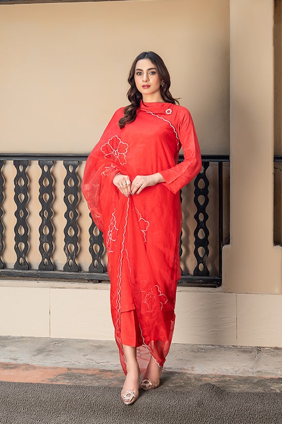 A beautifully flattering design “ Tabeer” is crafted from sumptuous raw silk adorned with a stylish neckline barouche and paired with an ornamental organza dupatta cinched with sitara work all over it . This barouche bejeweled dress is ideal for the fresco affairs and soirees.